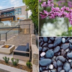 Terraces and stair transitions are artfully manipulated for ease of ascent from the lowest garden to the pool’s infinity basin-pond, upward to the pool deck, and finally the lowest level of the home. Terraces are crafted from stone and concrete, while walls hierarchically integrate with the house from materials like stone, integrally colored plaster, and board formed concrete.