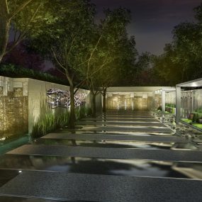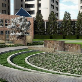 The site is rimmed by a profusion of Cherry and Magnolia trees is in stark contrast to its urban industrial context, while its core is more densely wooded by tiers of trees that offer dappled light to a wonderful Amphitheater garden. Viewed from the building’s main interior gallery and corridor, the garden is animated with a bronze walled lyrical fountain. Entry gardens and exterior corridors are further accented by museum like gardens with large fountain walls and basins, bronze sculptures, for active and passive enjoyment.