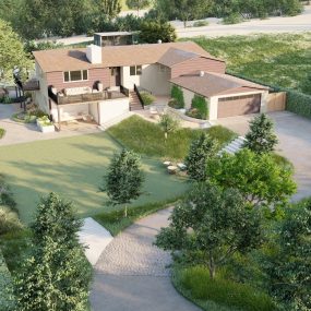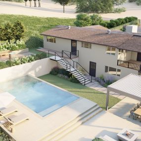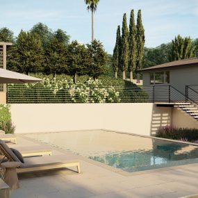 At the front, a regulation soccer field, terraced “stadium seating,” and a reimagined circular drive establish a dramatic arrival sequence. This reconfiguration introduces a new front entry stair, a lower loggia space, and expansive gardens wrapping the perimeter of the large front yard, balancing functionality with elegance.