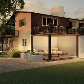 - – Multi-tiered hillside design with direct new egress connections from residence