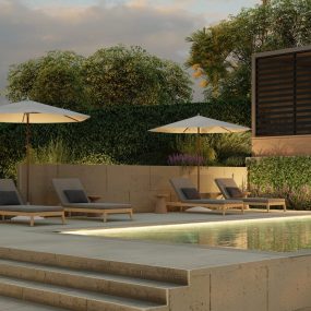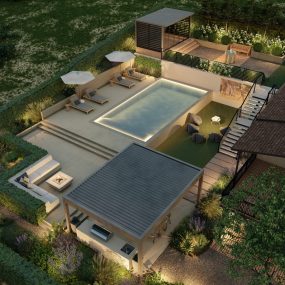 By night, the terraces transform into glowing outdoor rooms. Subtle lighting highlights pathways, planting edges, and gathering zones, ensuring safe circulation while creating an inviting atmosphere for evening dining, fireside conversation, or open-air cinema at the outdoor theater.