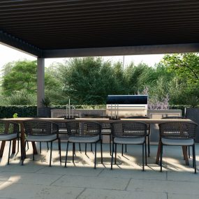 - Lower terrace: An expansive outdoor kitchen, covered dining pavilion, and fireplace lounge that extend the home’s living space into the landscape.