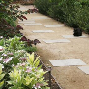 CAT’S GAME! Just as this shot was taken, the family cat plopped itself precisely down on one of the pavers like a game piece. Funny enough, the vision for this paving layout was based on a deconstructed game board.