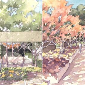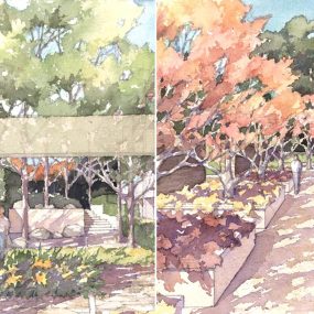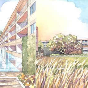 New freestanding stonewalls are used to define garden rooms, and to create layers of space, light and shadow. Short walls mark the entry court as the center in a sequence of library, entry, and orchard gardens. Several long walls enclose the main central garden and screen views to and from residential units. The walls are combined with large reflecting pools to suggest a kind of moat-like treatment of the space.