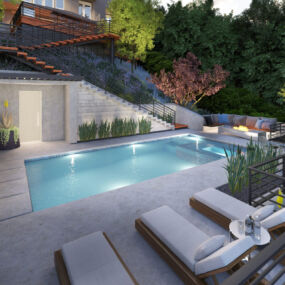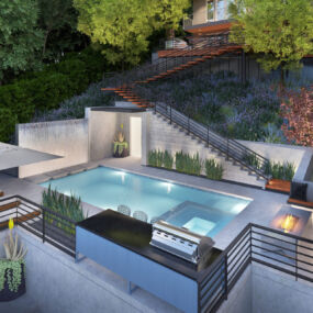 We were tasked with designing a pool and spa, fire and water features, outdoor kitchen, and a bathroom/changing room, all while maintaining as much of an existing deck as possible. Given one does not grade earth around mature trees, we had to work within the confines of even tighter parameters to preserve the existing Himalayan Cedars. This particular site did not bode for an infinity pool that would loom high above the downhill slopes. The design feature came at great expense, and at the great expense of all the other features that we were instead able to include.