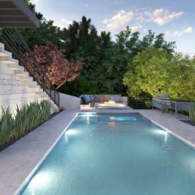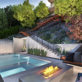 The push and pull of wall planes, textural and shadows play into a dynamic interlude of features in this strong, architecturally compelling landscape. We wanted to be sure to pack it full of everything one may need for hours of enjoyment. As the sunset glistens in the reflection of the water wall capping the end of the pool, the ascension up the 40 stairs leaves only the memory of the day’s good times behind. A true staycation experience.